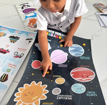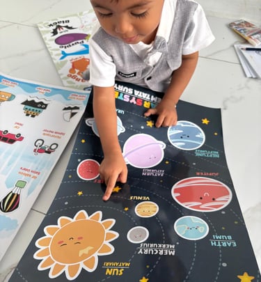 💡 Contoh aktivitas: sebutkan nama planet satu per satu lalu tutup kartunya, ajak anak menyusunnya kembali dari ingatan. Ini melatih konsentrasi dan kepercayaan diri anak dalam mengingat informasi.